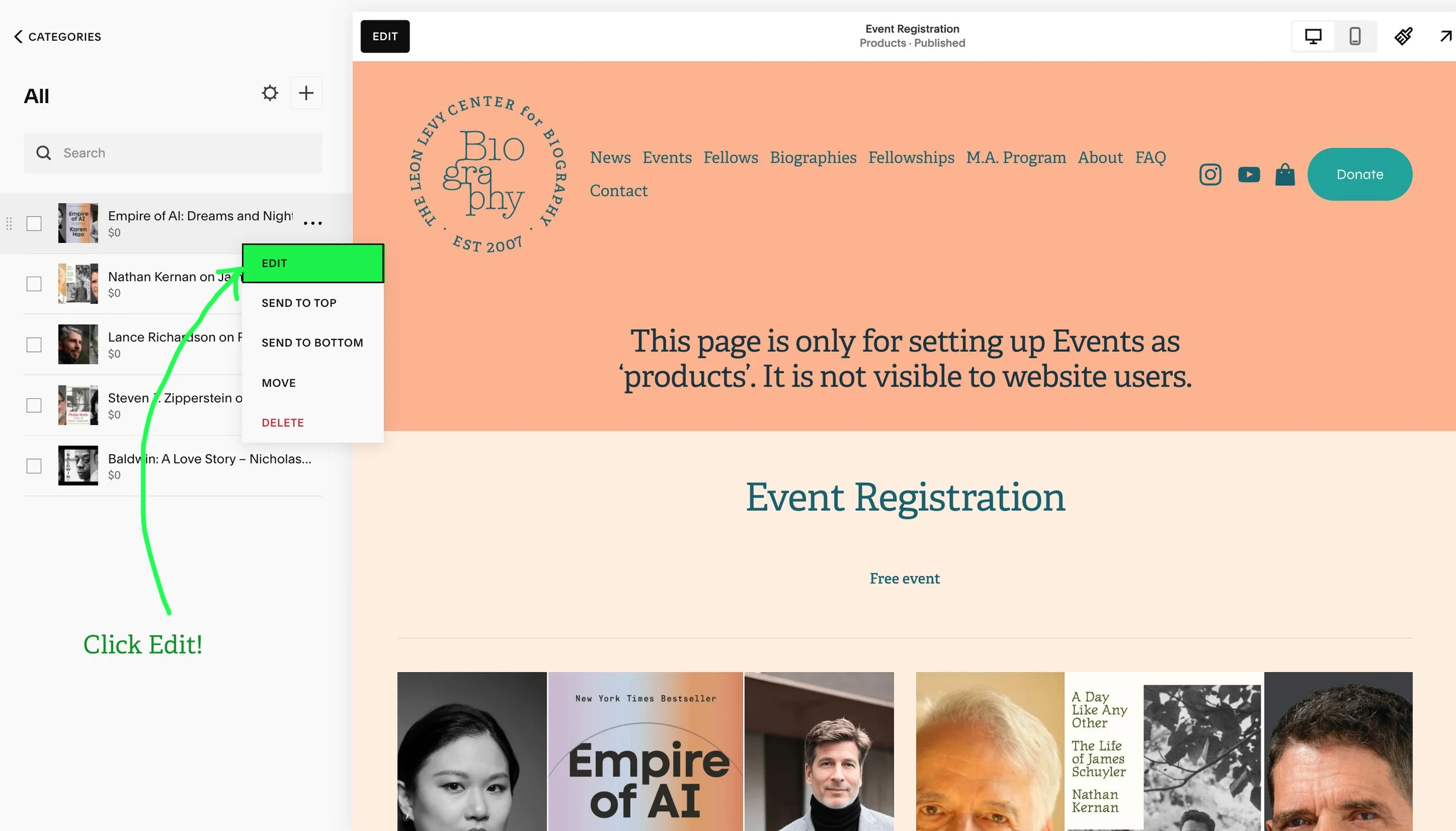 You access the public event page by clicking on the draft page in the left hand menu. Then, click the black ‘Edit’ button .